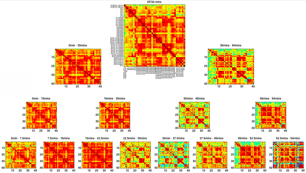 But what if the system isn’t stationary? Is that “average” view of inter-regional relationships the whole story, or could additional insight be gained by examining how these connections fluctuate from second to second and minute to minute during a scan? While the static connectome has proven highly informative (as evidenced by thousands of studies), there may also be valuable information in these short-term, transient reconfigurations of brain connectivity. Understanding the meaning and potential clinical relevance of such time-varying functional connectivity remains an active and evolving area of research; one to which I have devoted many efforts.