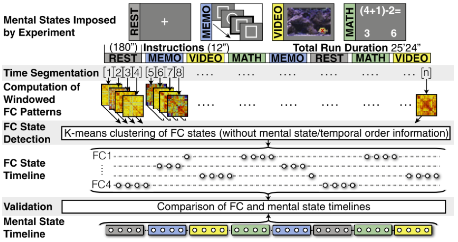 If dynamic reconfiguration of FC relates to cognition, then engaging in different mental activities should lead to corresponding changes in FC patterns. I demonstrated this in our 2015 PNAS publication, where participants were asked to mentally switch among four distinct mental activities while being continuously scanned during both engagement and transitions between them. The results confirmed that cognitive state changes indeed induce FC reconfigurations.
